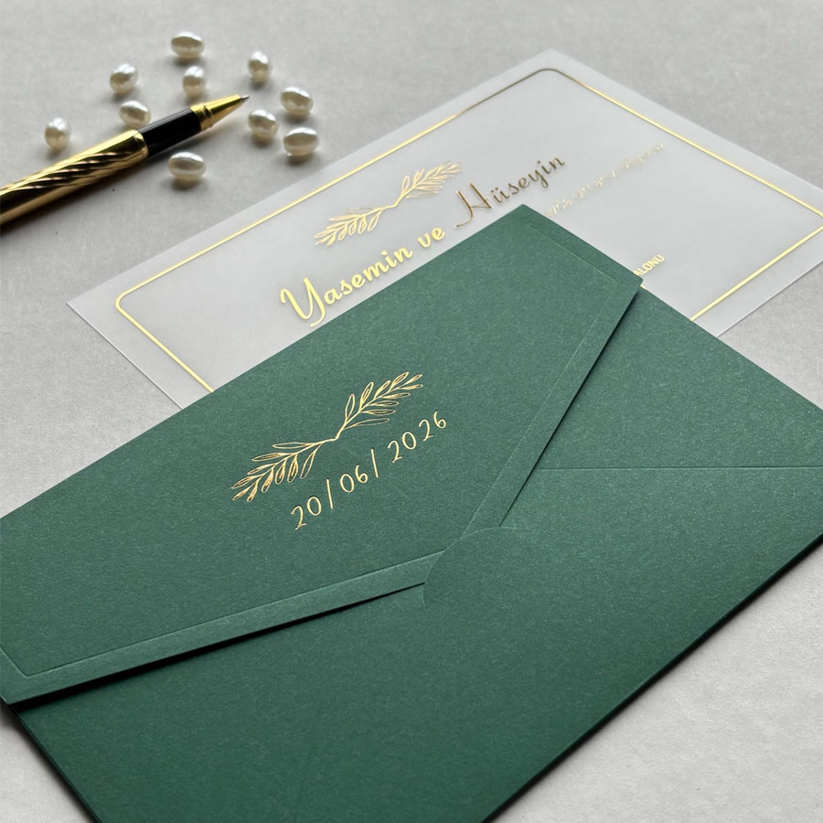 Yatay Dikdörtgen Yeşil Zarf Gold Yaldızlı Şeffaf Davetiye - 820