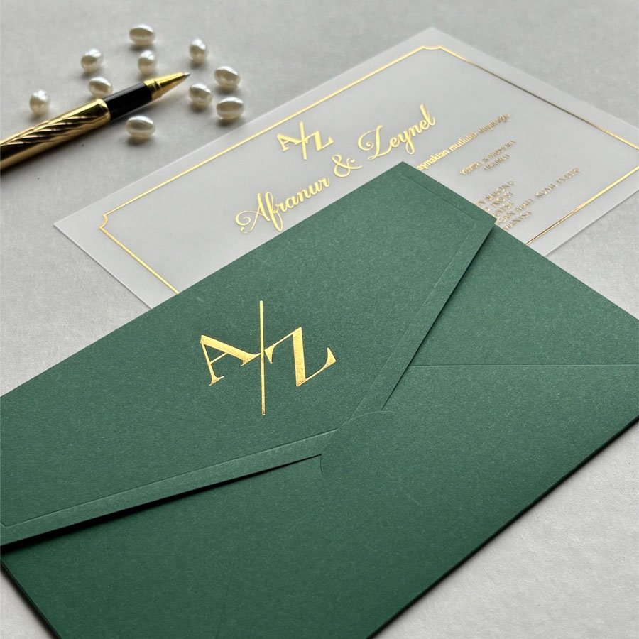 Yatay Dikdörtgen Yeşil Zarf Gold Yaldızlı Şeffaf Davetiye - 910