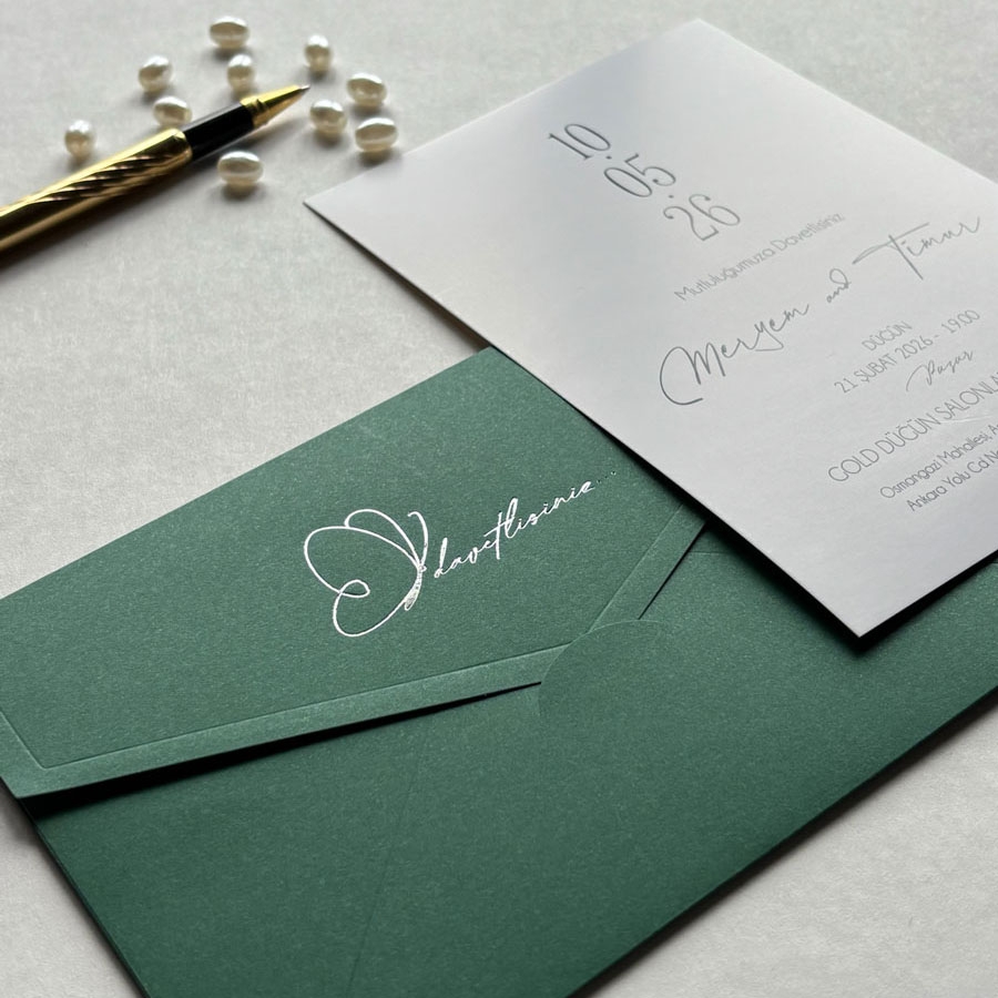 Zarf 220 gram renklendirilmiş bristol, iç kart ise 250 gram Amerikan Bristol karta baskı yapılmaktadır.