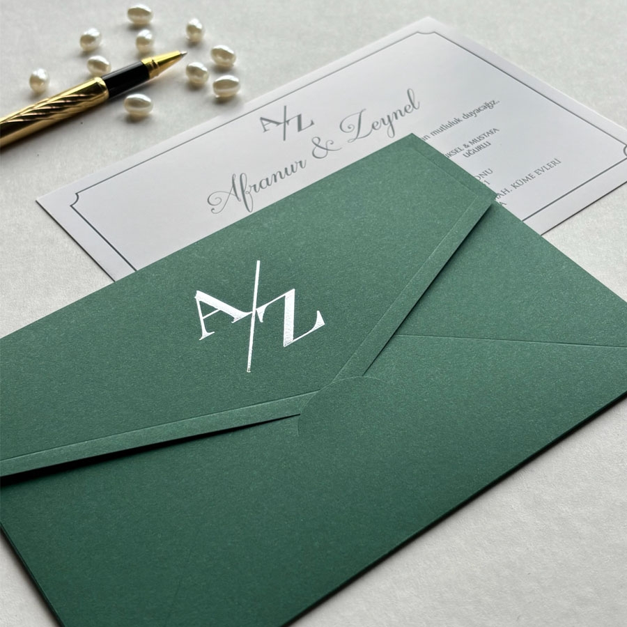 Yatay Dikdörtgen Yeşil Zarf Gümüş Yaldızlı Davetiye - 660
