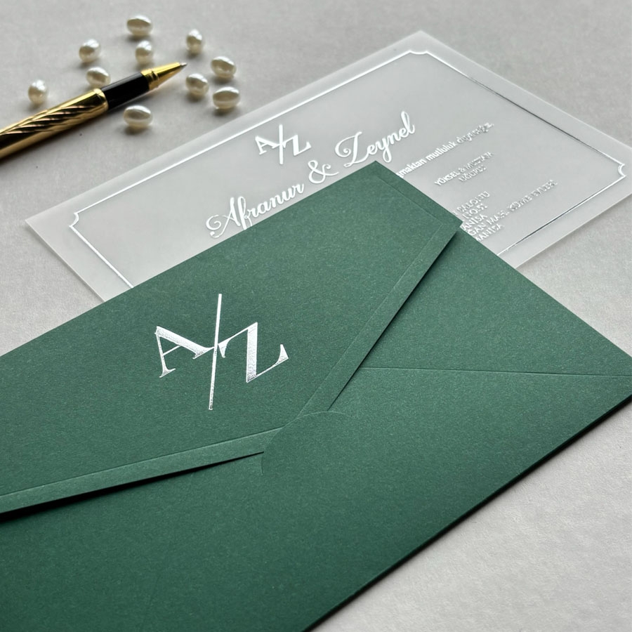Yatay Dikdörtgen Yeşil Zarf Gümüş Yaldızlı Şeffaf Davetiye - 630