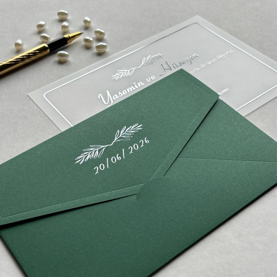 Yatay Dikdörtgen Yeşil Zarf Gümüş Yaldızlı Şeffaf Davetiye - 680