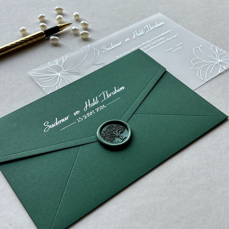 Yatay Dikdörtgen Yeşil Zarf İç Kart Şeffaf Gümüş Yaldız Baskılı Mühürlü Davetiye - 104