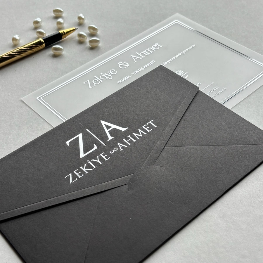 Yatay Siyah Zarf Gümüş Yaldızlı Şeffaf Davetiye - 425