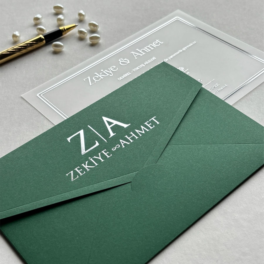 Yatay Yeşil Zarf Gümüş Yaldızlı Şeffaf Davetiye - 420
